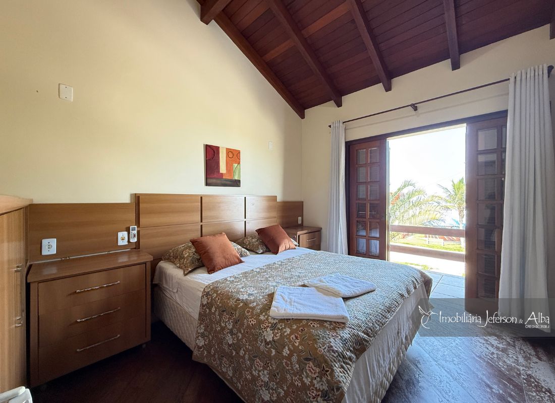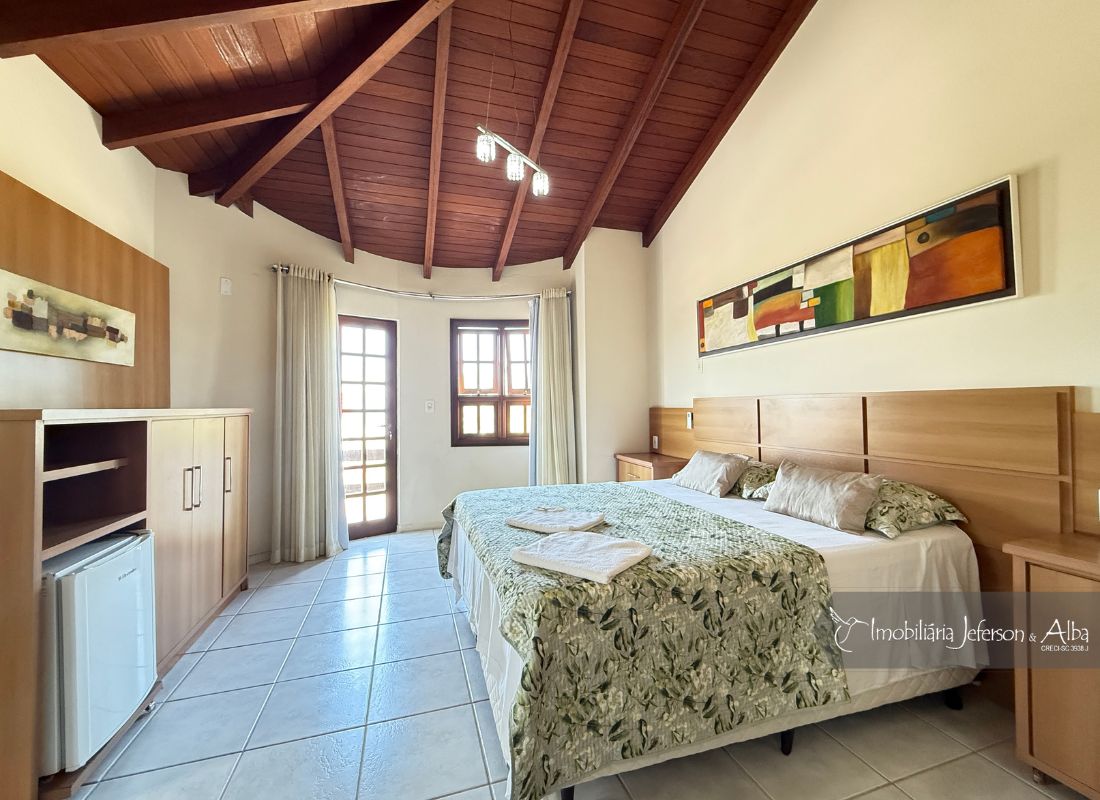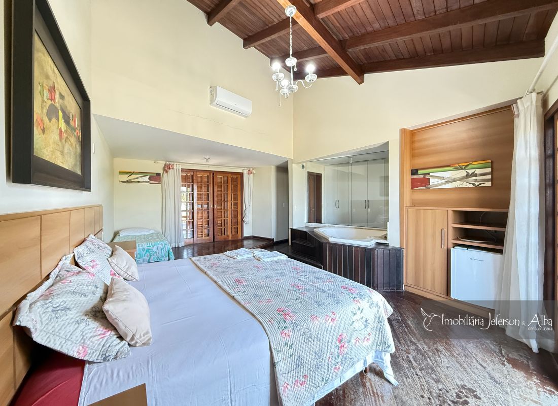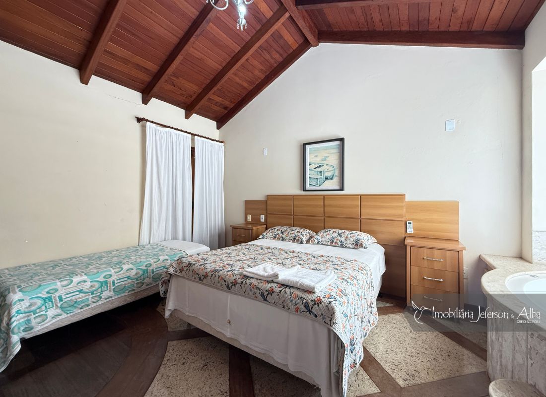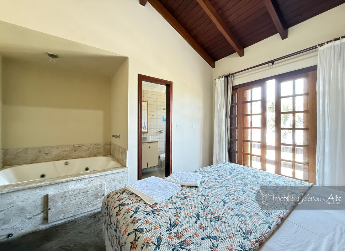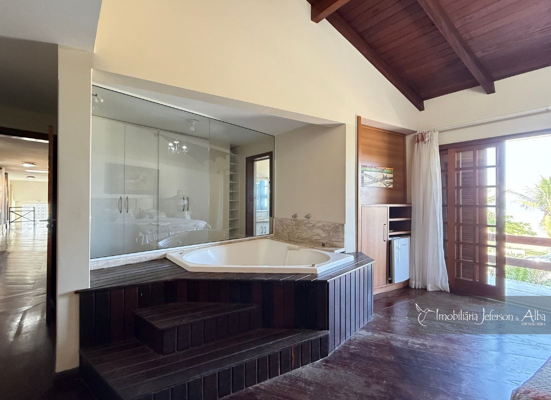 06 suítes c/ banheiras de hidromassagem (sendo 4 suítes c/ sacadas vista mar, 01 suíte c/ sacada vista lateral, 01 suíte c/ sacada vista fundo), camas box (2 x 2), ares condicionados, aquecedor de passagem, 01 living, 01sala TV, 01sala de jantar, 01lareira, 01lavanderia, 02depositos, 01cozinha, 01 churrasqueira, 03 vagas de garagem cobertas, 01lavabo, 01BWC social, 01piscina 15,00m x 2,00m x 1,20 profundidade.